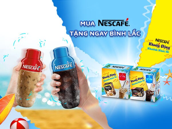 Hè này không như thế khi đã có NESCAFÉ phiên bản mùa hè. Mua ngay NESCAFÉ để nhận ngay bình lắc "shaker", lắc thật sảng khoái để uống NESCAFÉ ngon hơn, mát lạnh với lớp bọt cà phê đầy hấp dẫn. Có bình lắc NESCAFÉ khuấy động khoảnh khắc hè sẽ không còn cáu kỉnh, cho mình gần nhau hơn.