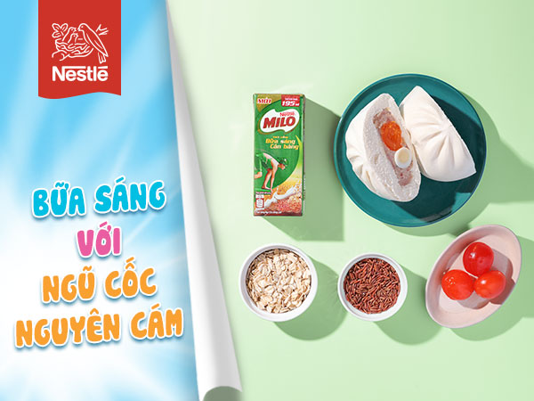 Ngũ cốc nguyên cám giàu chất xơ, vitamin và khoáng chất sẽ giúp trẻ nạp năng lượng cho cả ngày năng động. Thế nên, Gia Đình Nestlé đã chuẩn bị những món ăn sáng vô cùng hấp dẫn như bánh bao xá xíu, bánh mì chà bông, xôi lá chuối nhân thịt gà và trứng muối dùng chung với Thức uống lúa mạch MILO ít đường. Bữa sáng này sẽ giúp trẻ bổ sung đủ các chất dinh dưỡng cần thiết để trẻ tràn đầy năng lượng và có một thể lực thật tốt đó nha.